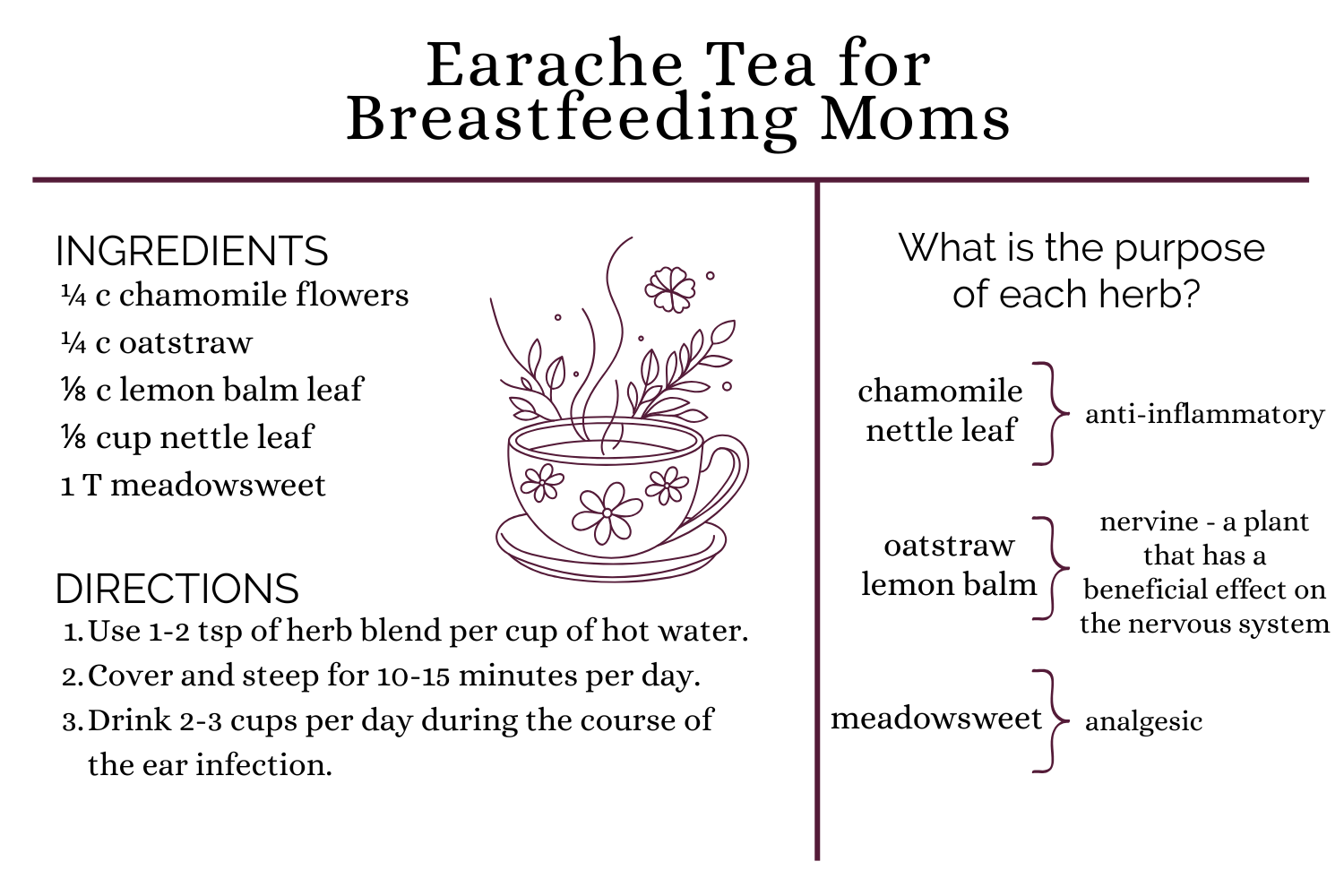 Chamomile tea - If breastfeeding, mom can drink a minimum of 1-2 cups a day. Baby can have 2-3 drops of cooled tea at the same time. Chamomile tea relieves pain and calms the nerves, in both mom and baby. It is also helpful for irritability.