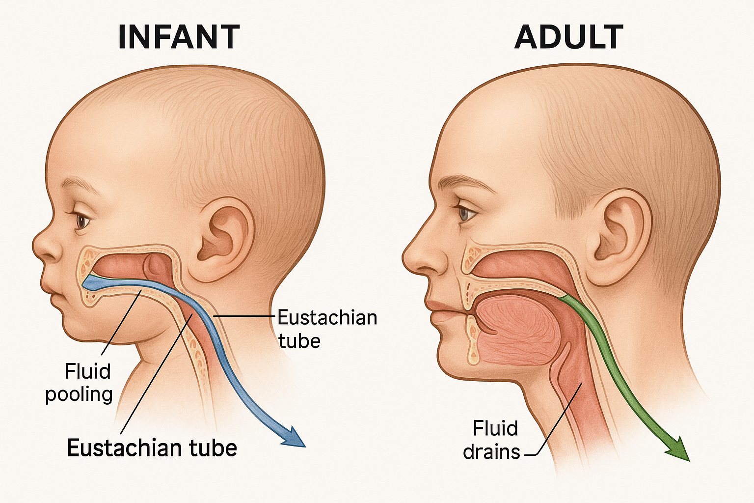 Infants and young children have small, short tubes which run horizontally. This length and positioning doesn’t allow gravity to help drain fluid well. Instead, it tends to pool in the middle ear and allow bacteria and viruses to grow. The tubes in children are also narrower and more flexible, with softer cartilage, which makes them more likely to collapse or become blocked.